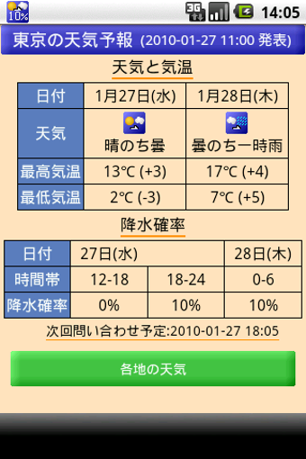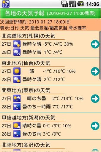 降水確率ステータスバーを開いたら、まずお住まいの地域を選択しましょう。選択後、今日と明日の天気、気温、降水確率がチェックできる他、お使いのスマートフォンのステータスバーに今日の天気と降水確率が表示されたアイコンが現れます。6時、12時、18時頃に自動的に更新されるので、わざわざアプリを開いて手動で更新する手間が省けます。